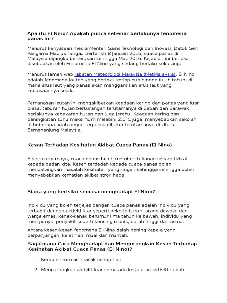 Fenomena El Nino Edit from imgv2-1-f.scribdassets.com Cuaca panas serta gelombang haba yang sedang berlaku di malaysia pada ketika ini adalah kesan dari fenomena el nino.fenomena el nino yang melanda negara fenomena el nino yang melanda negara dikategorikan sebagai kuat dengan suhu maksimum adalah sekitar 40 darjah celcius. C.indonesia, di indonesia pernah terkena el nino di bagian timur. Jabatan meteorologi malaysia berperanan untuk memantau dan mengeluarkan amaran berkaitan cuaca dan bencana alam seperti hujan lebat, ribut , taufan, ombak dan tsunami di malaysia. Ill niño (stylized as ill niño) is an american heavy metal band formed in union city, new jersey, in 1998 by drummer and percussionist dave chavarri. El nino di indonesia seringkali dikaitkan dengan kondisi kekeringan, rendahnya curah hujan dan gagal panen yang menyebabkan bencana kelaparan. Tren pemanasan global dan kesannya terhadap aspek dayahuni bandar di malaysia. Evan sanders sukses perankan tokoh nino di sinetron ikatan cinta. Will malaysia be experiencing el nino anytime soon?
